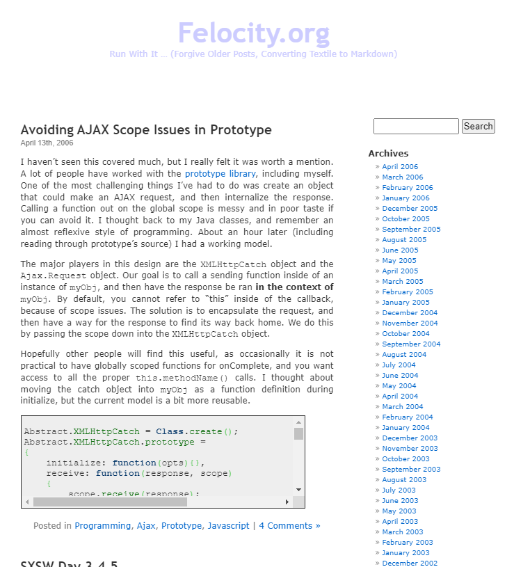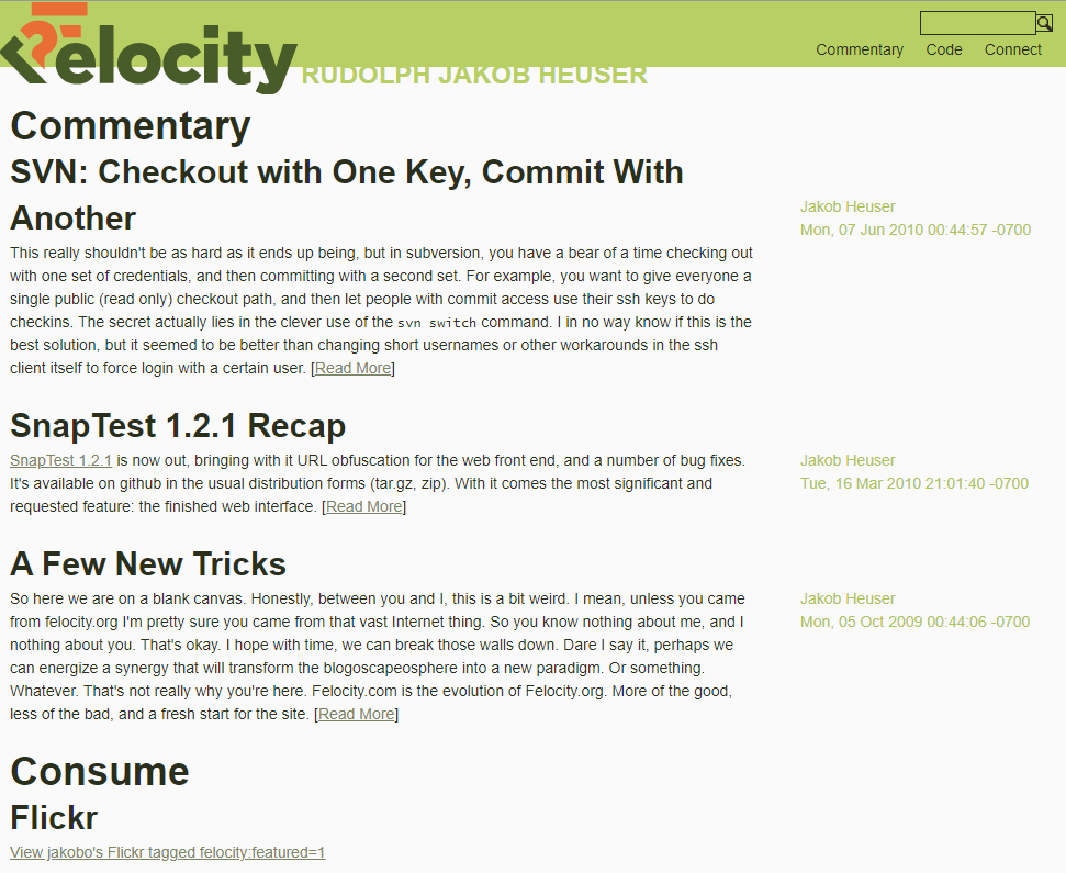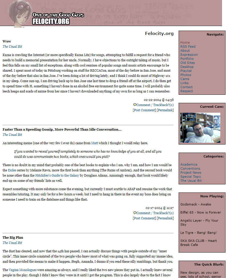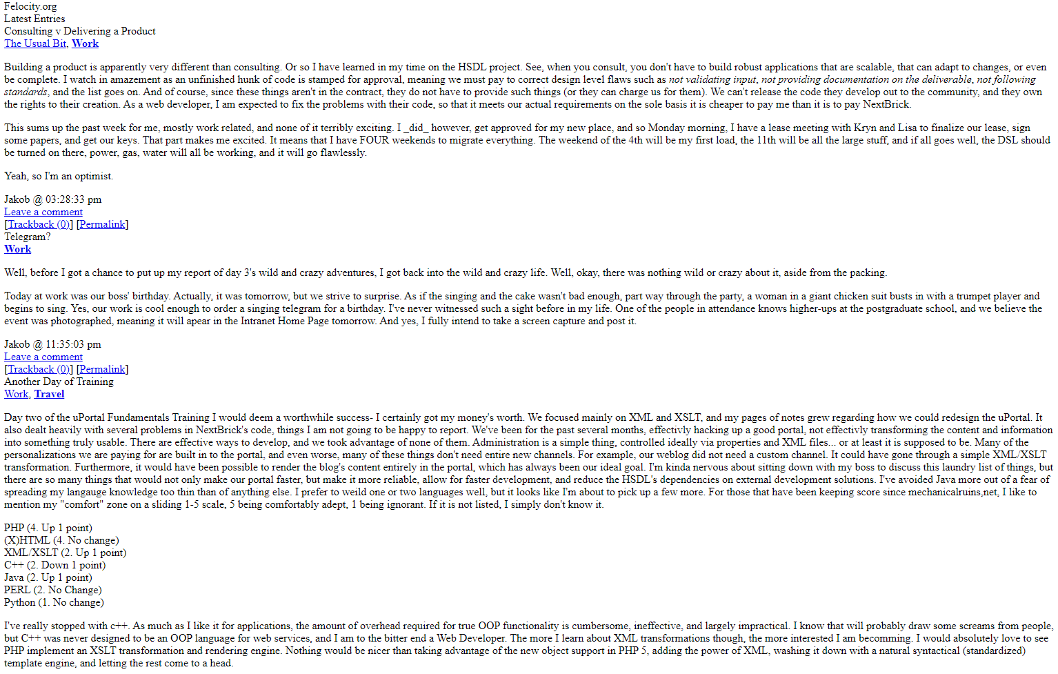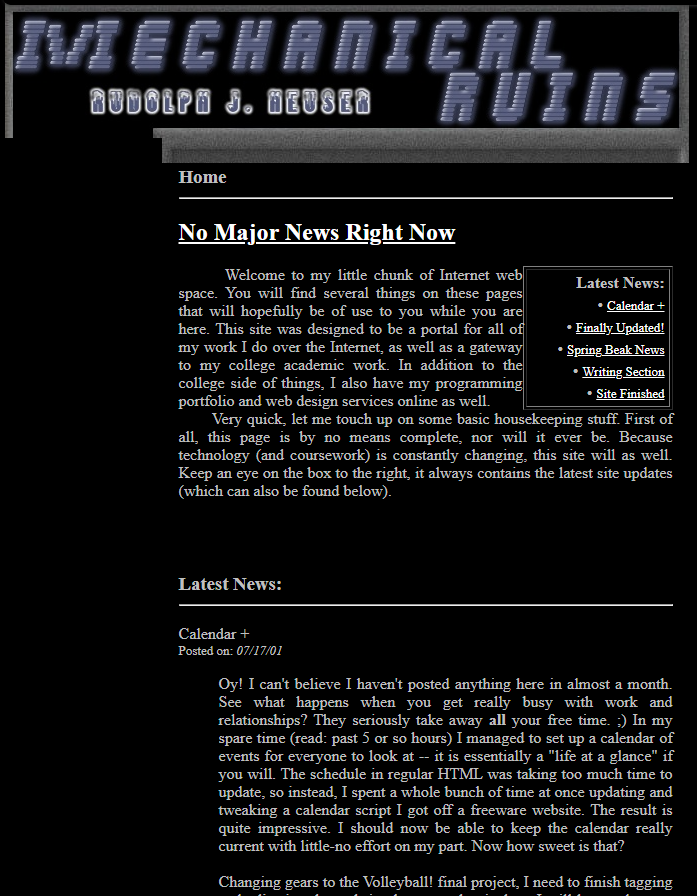As best I could, I've retrieved old screenshots from the Wayback Machine, before this site was ever called codedrift. From "mechanicalruins.net" to Felocity (.org, then .com), to my own name, then to codedrift.