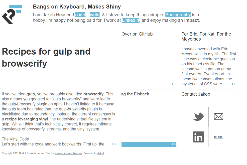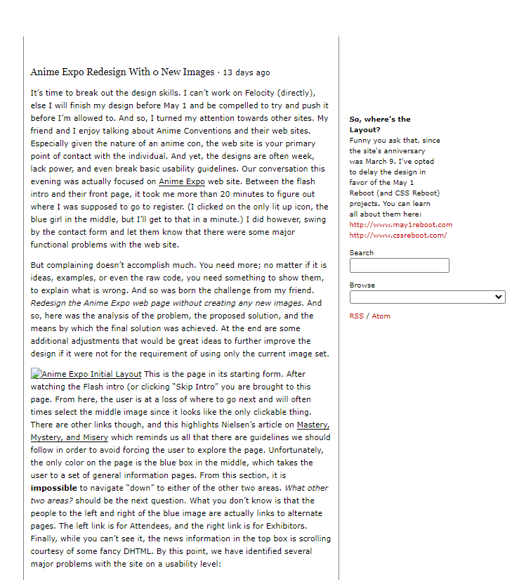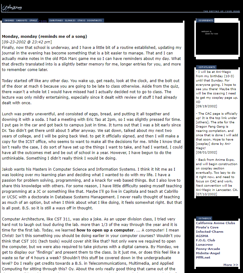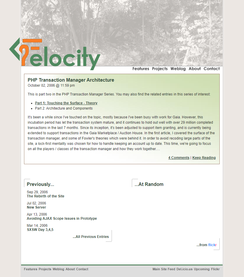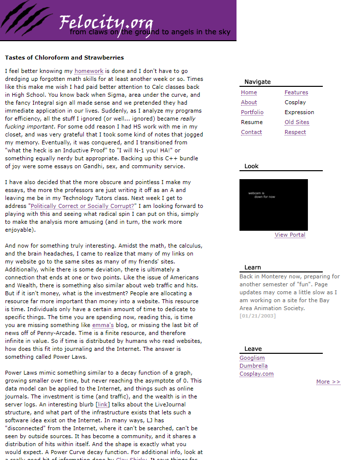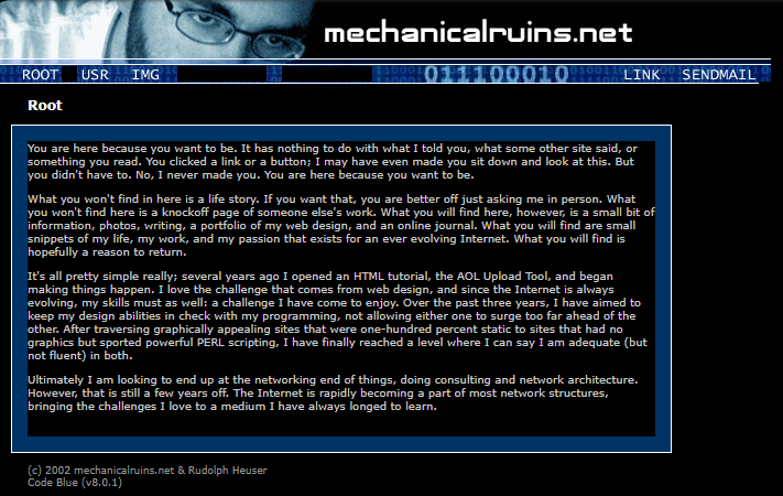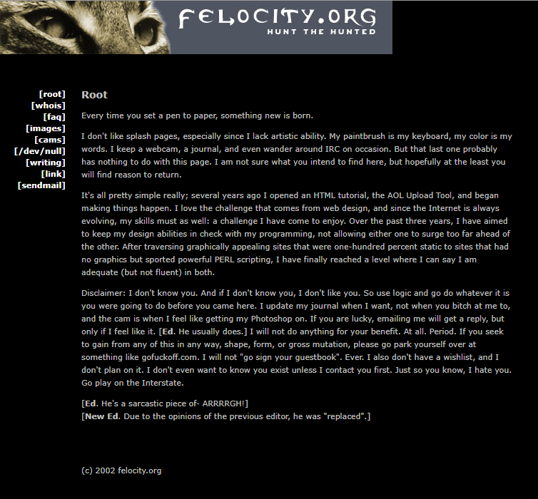 As best I could, I've retrieved old screenshots from the Wayback Machine, before this site was ever called codedrift. From "mechanicalruins.net" to Felocity (.org, then .com), to my own name, then to codedrift.