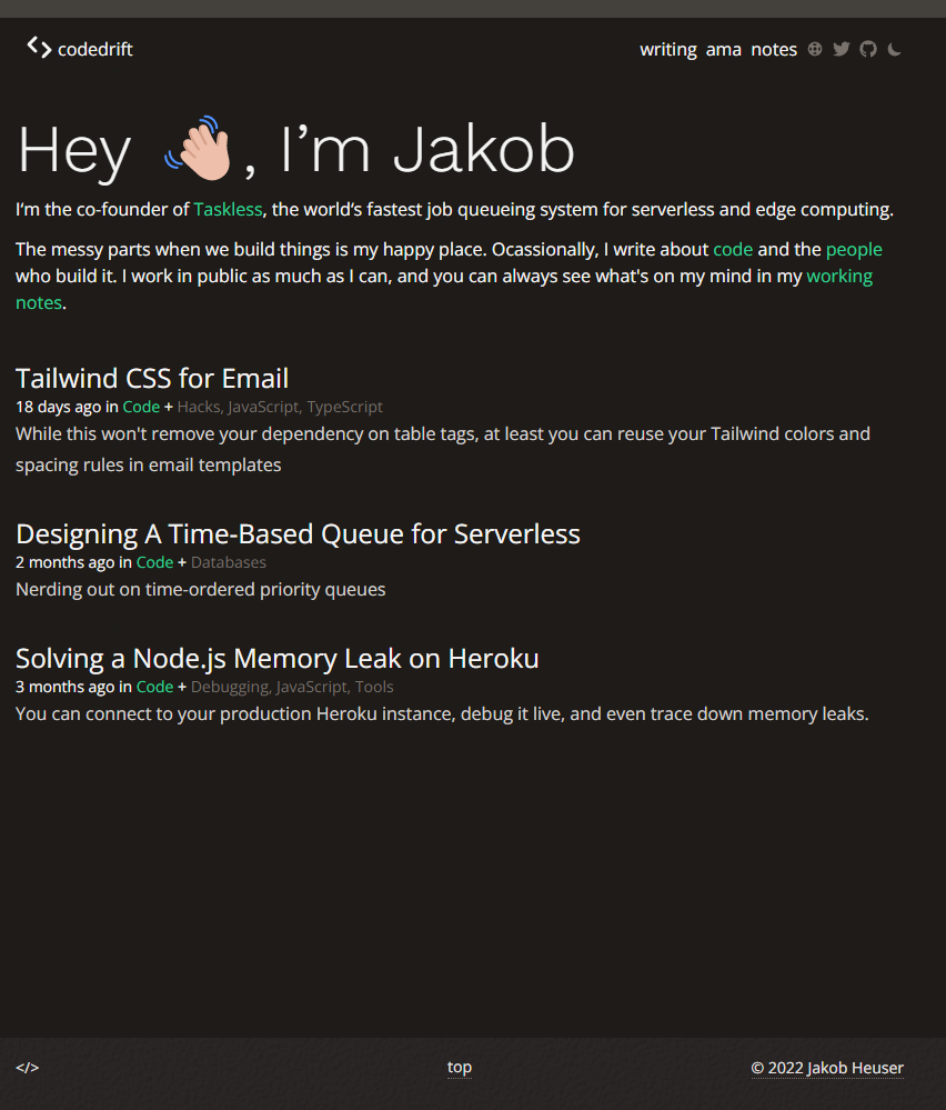 This is the second revision of the codedrift project, and the 15th revision of Jakob‘s personal site. In the last iteration, I wanted to play with a chunky interface while simultaneously learning tailwind. In this revision, I sought to take elements of codedrift I felt mattered in the design aesthetic and strip as much as I could away.